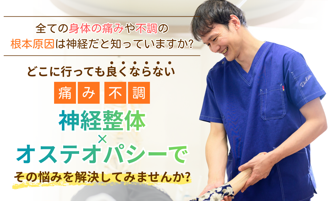 当院の特徴は【神経整体】・【オステオパシー】という技術で症状の改善に努めます。